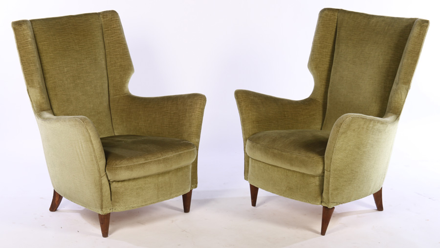 A pair of green upholstered Italian club chairs in the manner of Paolo Buffa