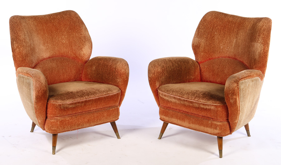 A pair of Italian mid century modern upholstered club chairs raised on turned legs
