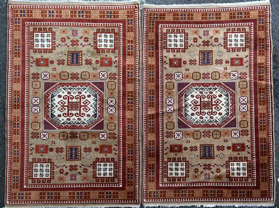 A pair of Kazak rugs, with central hooked medallion in a field of geometric motifs, on a beige ground, with four row border, 6ft 1in. by 4ft 1in.