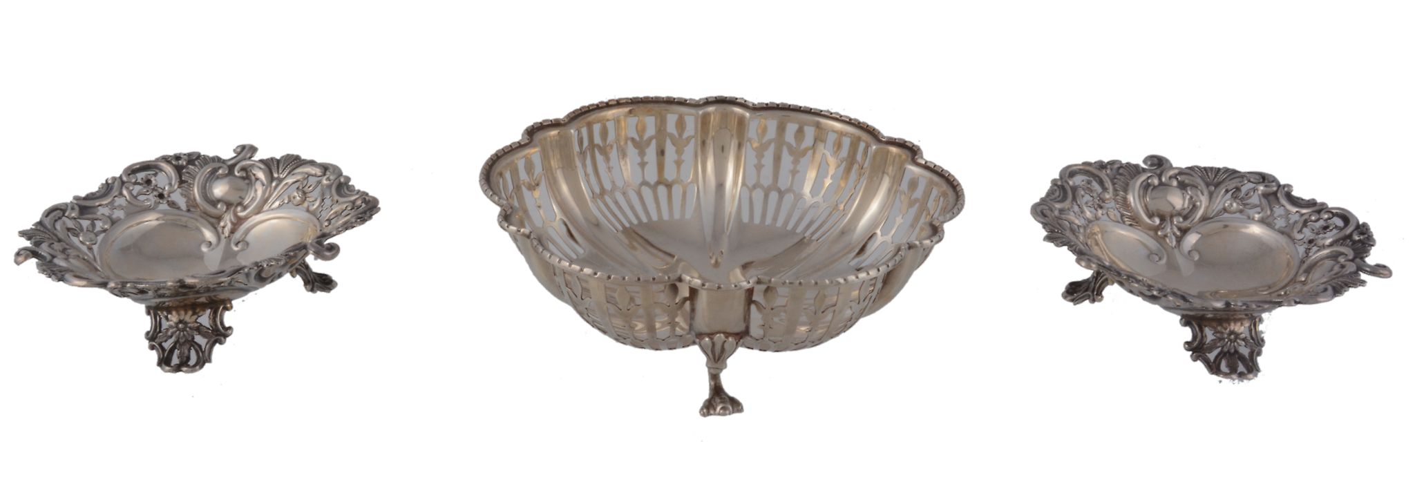 by Sibray, Hall & Co. Ltd, London 1894, retailed by Mappin & Webb, 9.5cm (3 3/4in) diameter; another larger shaped circular basket by E. S. Barnsley & Co., Birmingham 1919, 13cm (5in) diameter, 183g (5.9 oz) gross