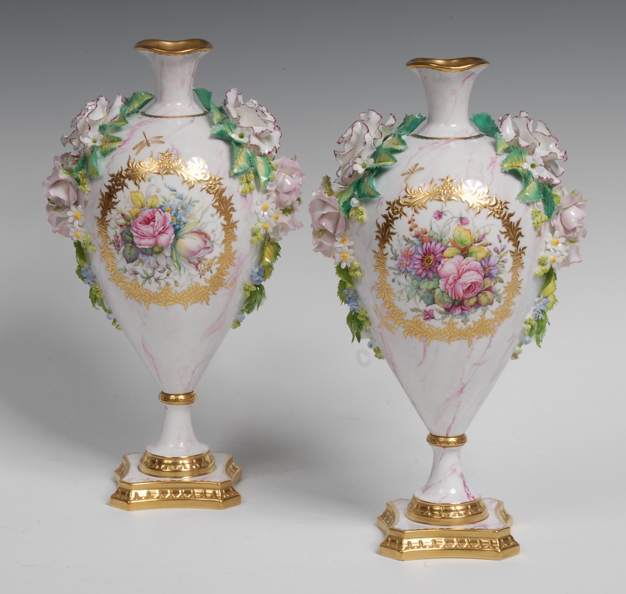 painted by Stefan Nowaki, signed, painted with colourful summer flowers, within leafy gilt cartouche, ... encrusted with carnations, forget-me-nots, roses and foliage, marbled ground, quatrefoil base, gilt borders, 26cm high, printed mark