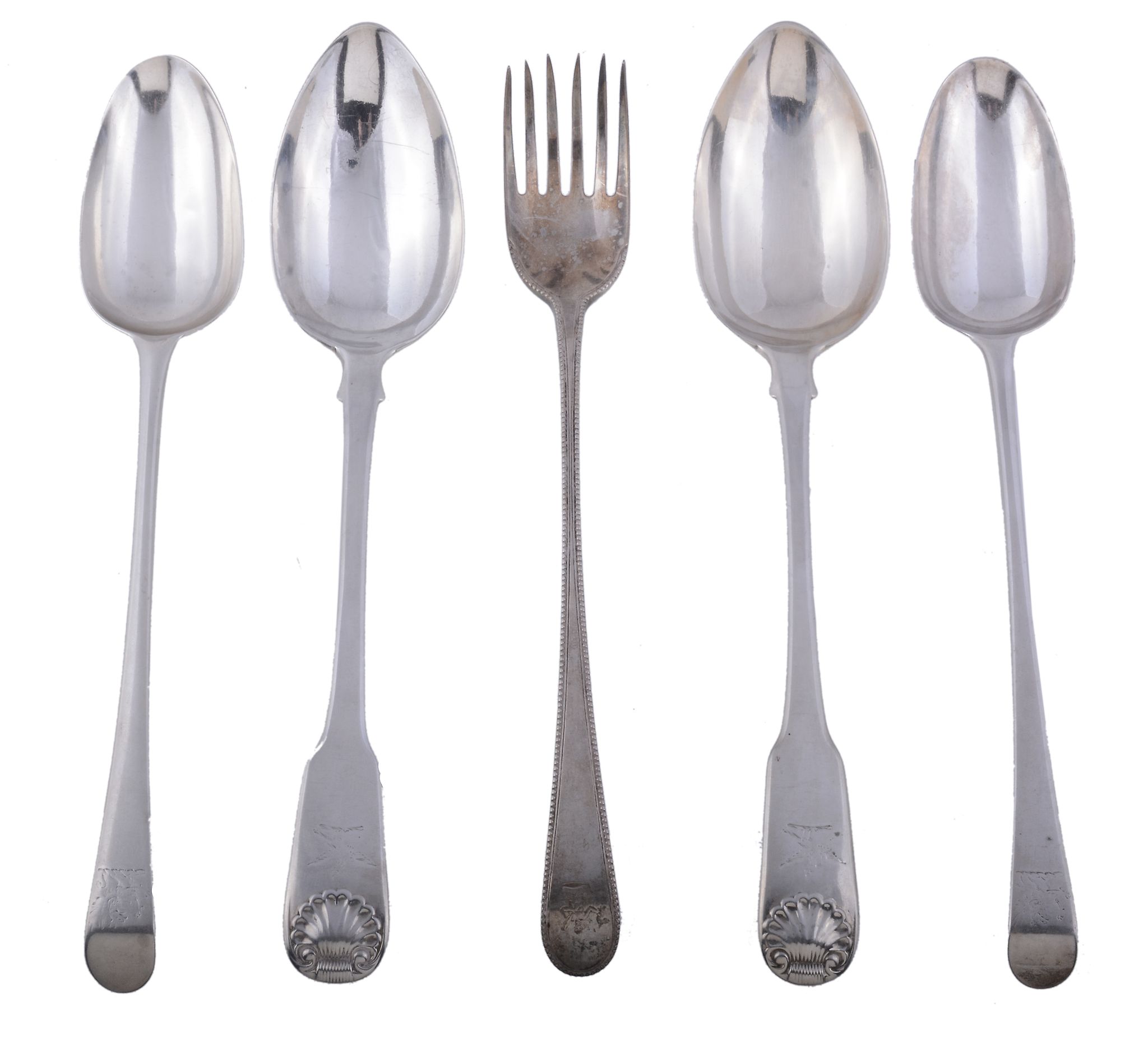 maker's marks compressed, London 1779, 28cm (11in) long; a pair of George IV fiddle and shell gravy spoons by John Harris IV, London 1820, 28.5cm (11 1/4in) long; and a George III old English beaded salad fork by Walter Tweedie, London 1776, 28cm (11