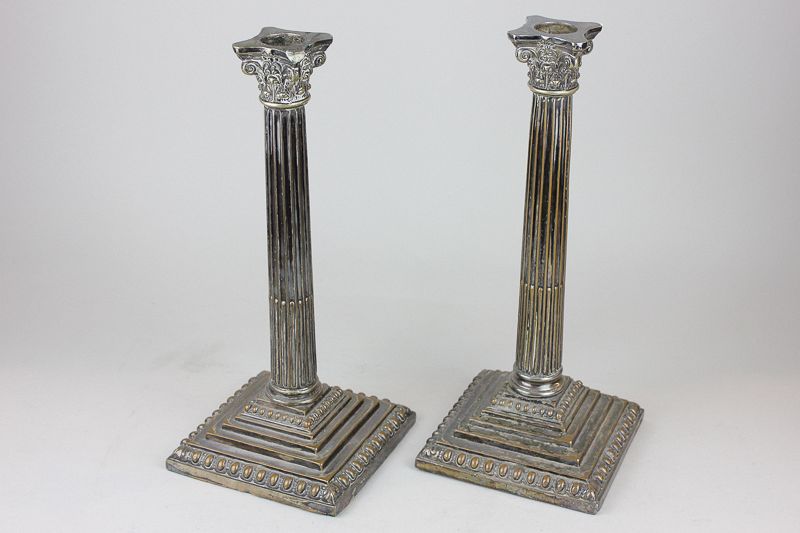 A pair of silver plated Corinthian column candlesticks on square stepped bases