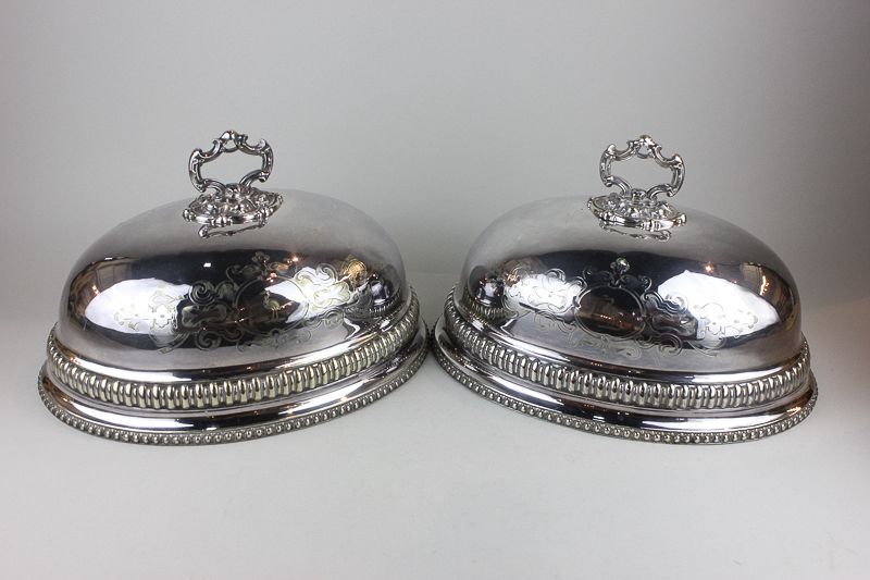 A pair of silver plated domed shaped oval covers, with engraved decoration and gadroon border 35cm