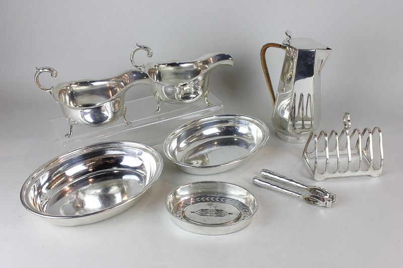 A pair of silver plated sauce boats, a toast rack, a coffee pot