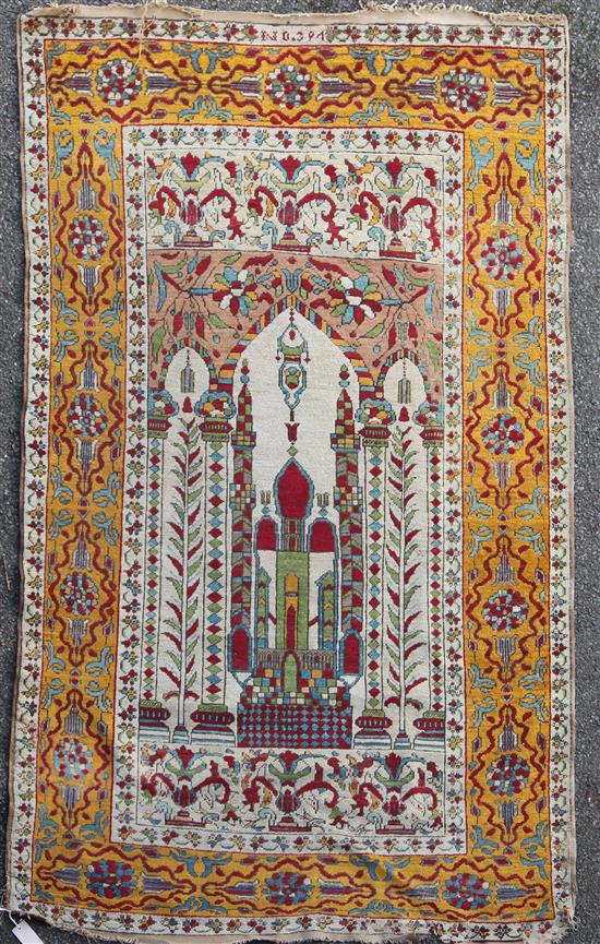 A Persian prayer rug, with central mihrab, on a beige and mustard ground, with three row border, 6ft 6in by 4ft 2in.