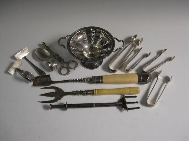 A pierced silver pedestal Dish, Birmingham 1949, four pairs of Sugar Tongs, pair of Nips, plated Stilton Scoop, Bread Fork and Pickle Fork