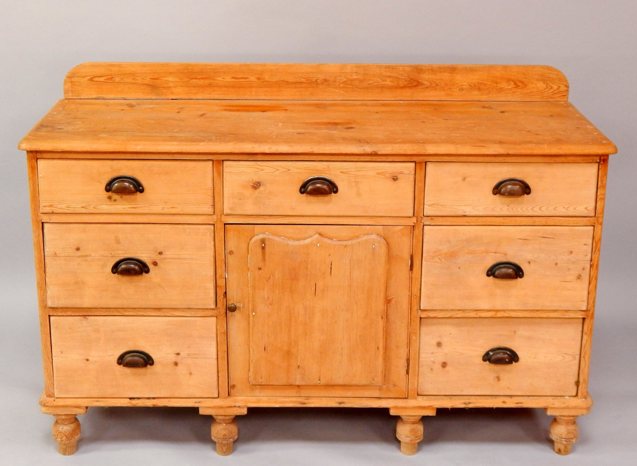 with an arrangement of six drawers flanking a panelled cupboard door, raised on turned feet