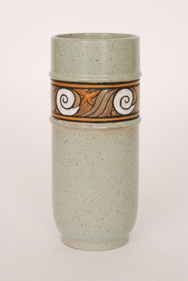 A Poole Pottery Stoneware cylinder vase decorated with an upper patterned band against a pale green mottled ground, impressed mark, faint monogram