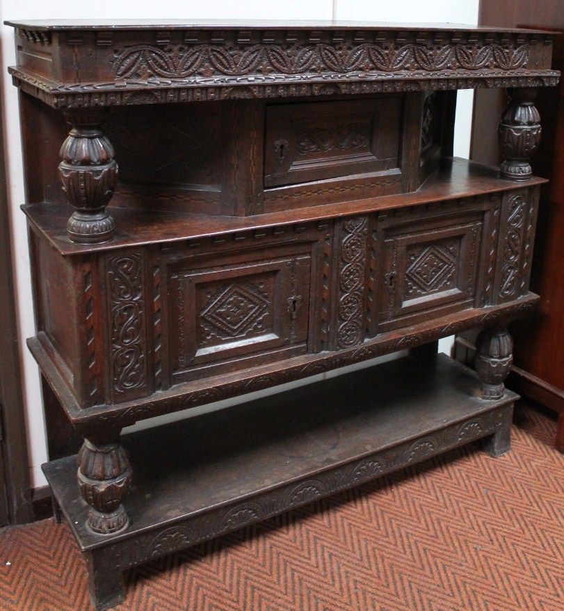 the rectangular top with a heavily carved geometric frieze above a central bacon cupboard with a chequer board inlay above two further cupboards and an open shelf, each section raised on heavy baluster columns, the whole terminating in block feet