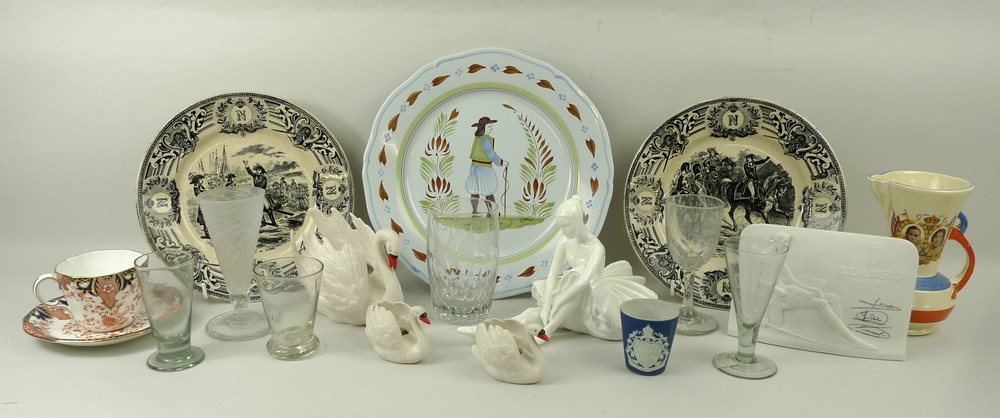 A quantity of ceramics including a Royal Doulton figure modelled as Ballet Lesson HN4028, Lladro Collector's Society parian sign, pair of French Napoleonic commemorative plates 'Napoleon et Kleber' and 'Du Haut de ces Monuments Quarante vous Cotemple