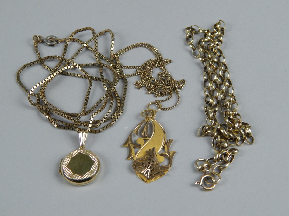 to include a 9ct gold belcher link necklace, 7.4g, a 9ct gold locket on box link chain, marked 375, 9.5g all in and a floral pendant, gold plated on a 9ct gold fine link chain (3)