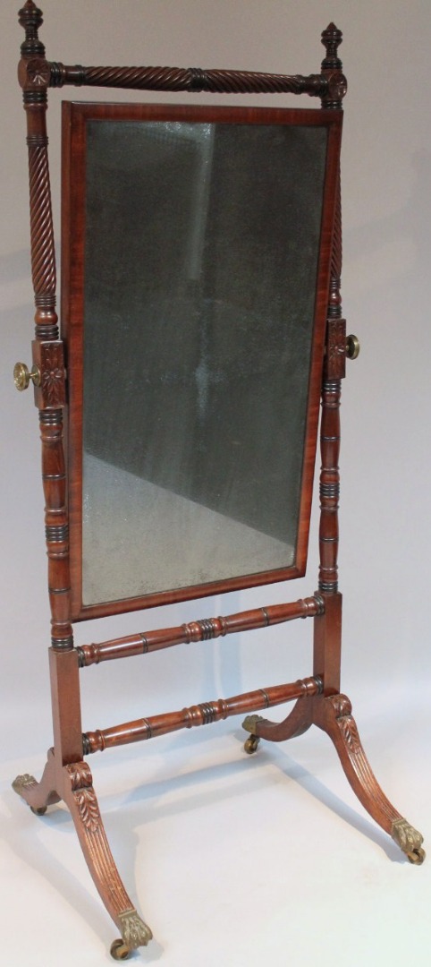 in the manner of George Bullock, the rectangular glass flanked by part barleytwist supports with a upper barleytwist stretcher and urn finials, on fluted acanthus capped sabre legs with brass hairy paw caps and metal castors, with side adjusting bras