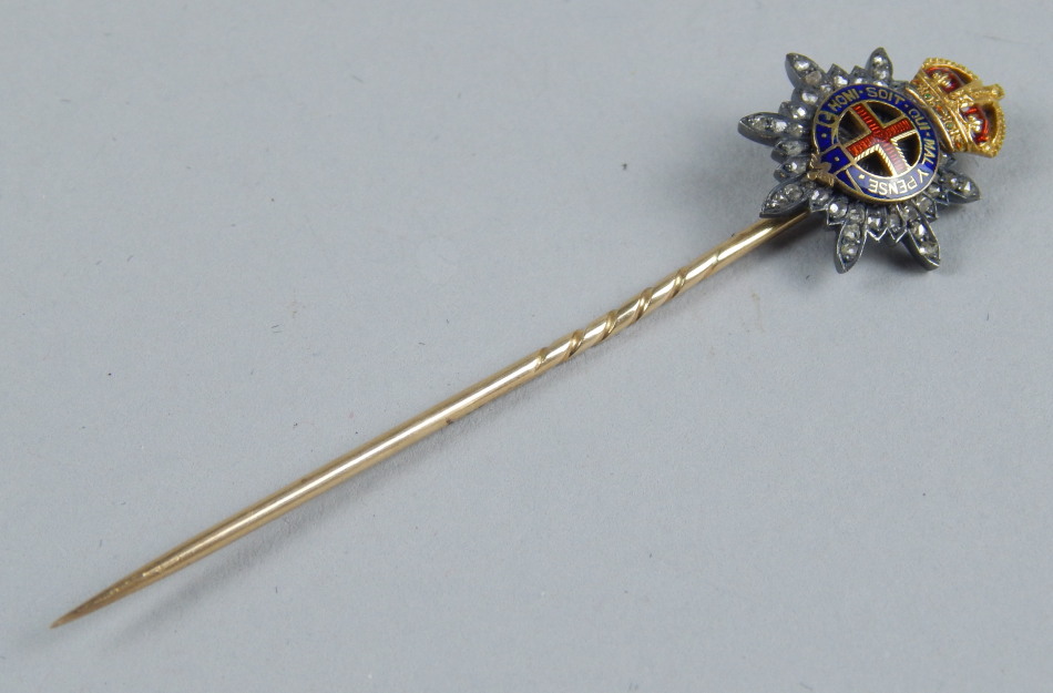 with red and blue enamel decoration, set with diamonds, bearing the words "Honi Soit Qui Mal Y Pense", on yellow metal pin, unmarked