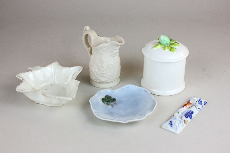 A Royal Copenhagen dish modelled as a lily pad with frog, a pickle dish, a Parian jug, a Crown Staffordshire pot with acorn fini