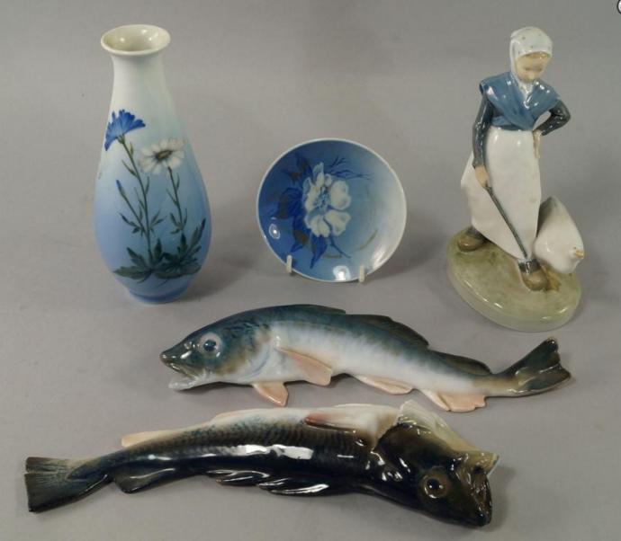 marks to base, 19cm high, together with a Royal Copenhagen vase, a small Copenhagen dish and two Danish porcelain models of fish