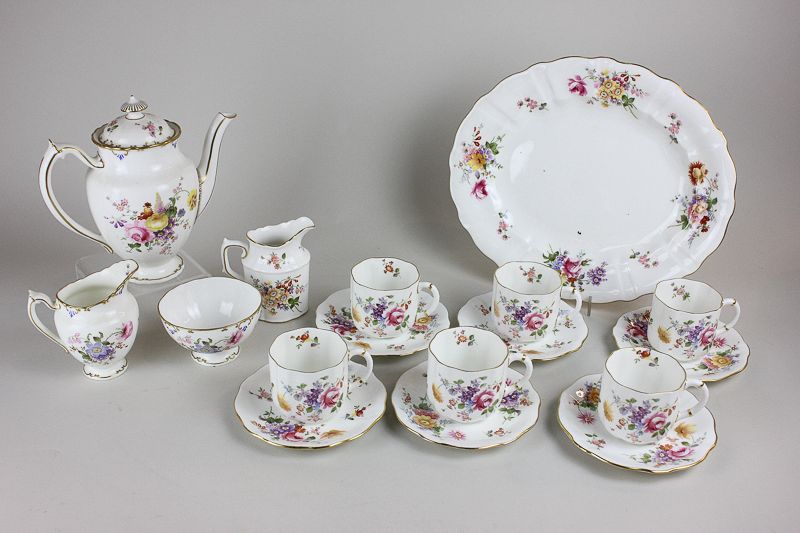 A Royal Crown Derby, Derby Posies pattern coffee set for six with an oval serving plate and a similar jug