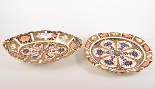 date cipher for 1922, Imari pattern, acorn and oak leaf handles, lobed outlines, width 30cm, a smaller dessert dish of the same design, date cipher for 1924, width 26cm, a pair of Imari pattern shaped circular stands, date cipher for 1926 and an Imar