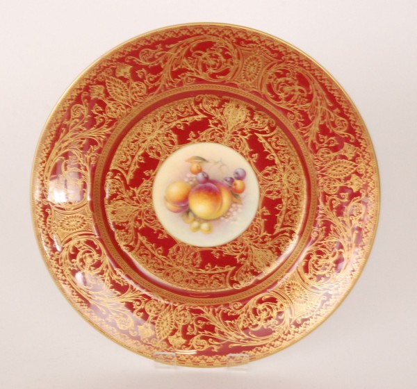 A Royal Worcester cabinet plate decorated by Telford with a hand painted roundel of peaches and cherries, the border edge in red with a gilt overlay pattern, gold printed mark, diameter 27cm