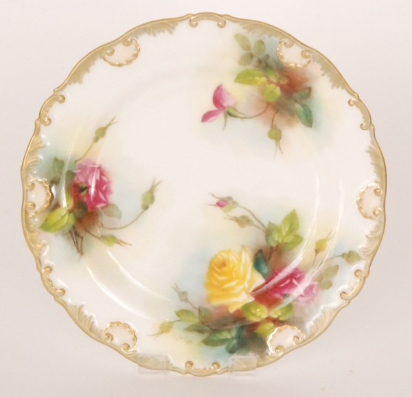 A Royal Worcester cabinet plate decorated by May Blake with hand painted Hadley roses, signed, puce mark with date code for 1910, diameter 22cm