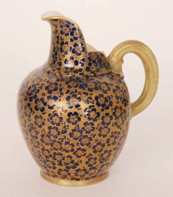 A Royal Worcester flatback jug, the body in royal blue with a gilt overlay pattern, green mark with date code for 1886
