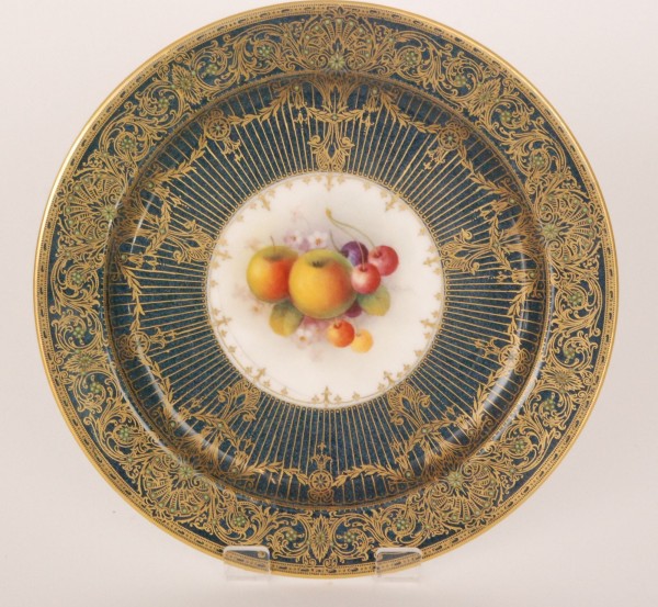 A Royal Worcester fruit painted cabinet plate decorated by Shuck with hand painted peaches and grapes, the border edge in blue with a jewelled gilt pattern overlay, puce mark with date code for 1919, diameter 22.5cm, A/F