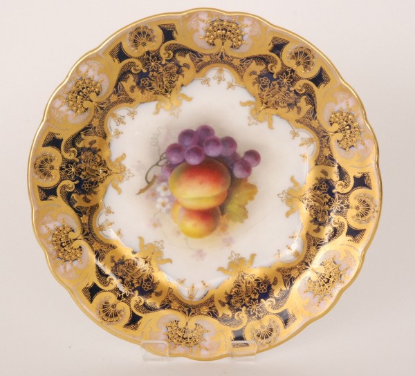 A Royal Worcester fruit painted cabinet plate decorated by Shuck with hand painted apples and cherries, the border edge in blue with a jewelled gilt pattern overlay, puce mark with date code for 1920, diameter 21.5cm, A/F