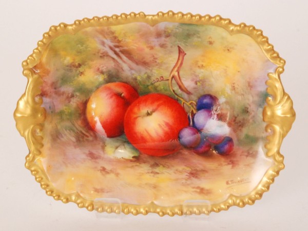 A Royal Worcester fruit painted rectangular dish decorated by Townsend with hand painted apples and grapes, signed, puce mark with date code for 1926, length 18cm, restored