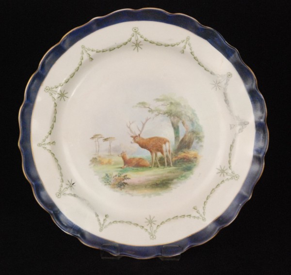A Royal Worcester Vitreous cabinet plate by Harry Davis with hand painted deer to a woodland setting, the border edge with garland and a blue border, blue printed mark with date code for 1903, diameter 23cm, extensively restored