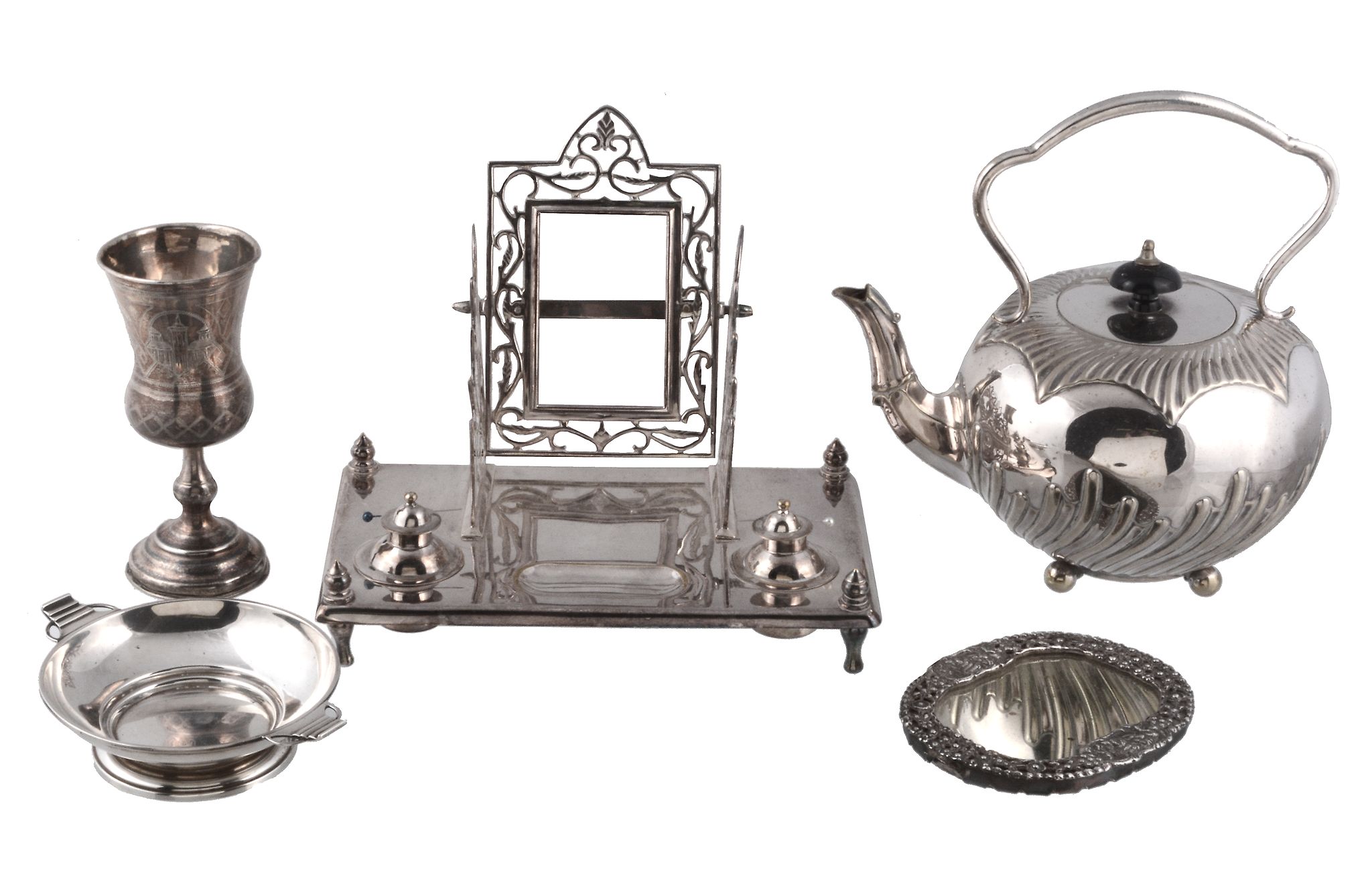 the baluster body engraved with linear bands and townscapes, on a turned stem and circular moulded spreading foot, 13.5cm high; a silver quaich by Walker & Hall, Birmingham 1935, on a circular foot, 14cm long; together with an electro-plated desk sta