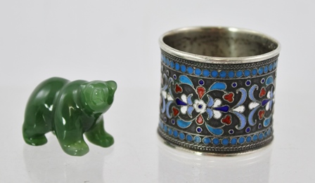enamelled in red, white and blue, having stylised floral central band, 3.5cm high, hallmarked 1896-1908, together with a carved and polished possibly Nephrite FIGURE OF A BEAR,