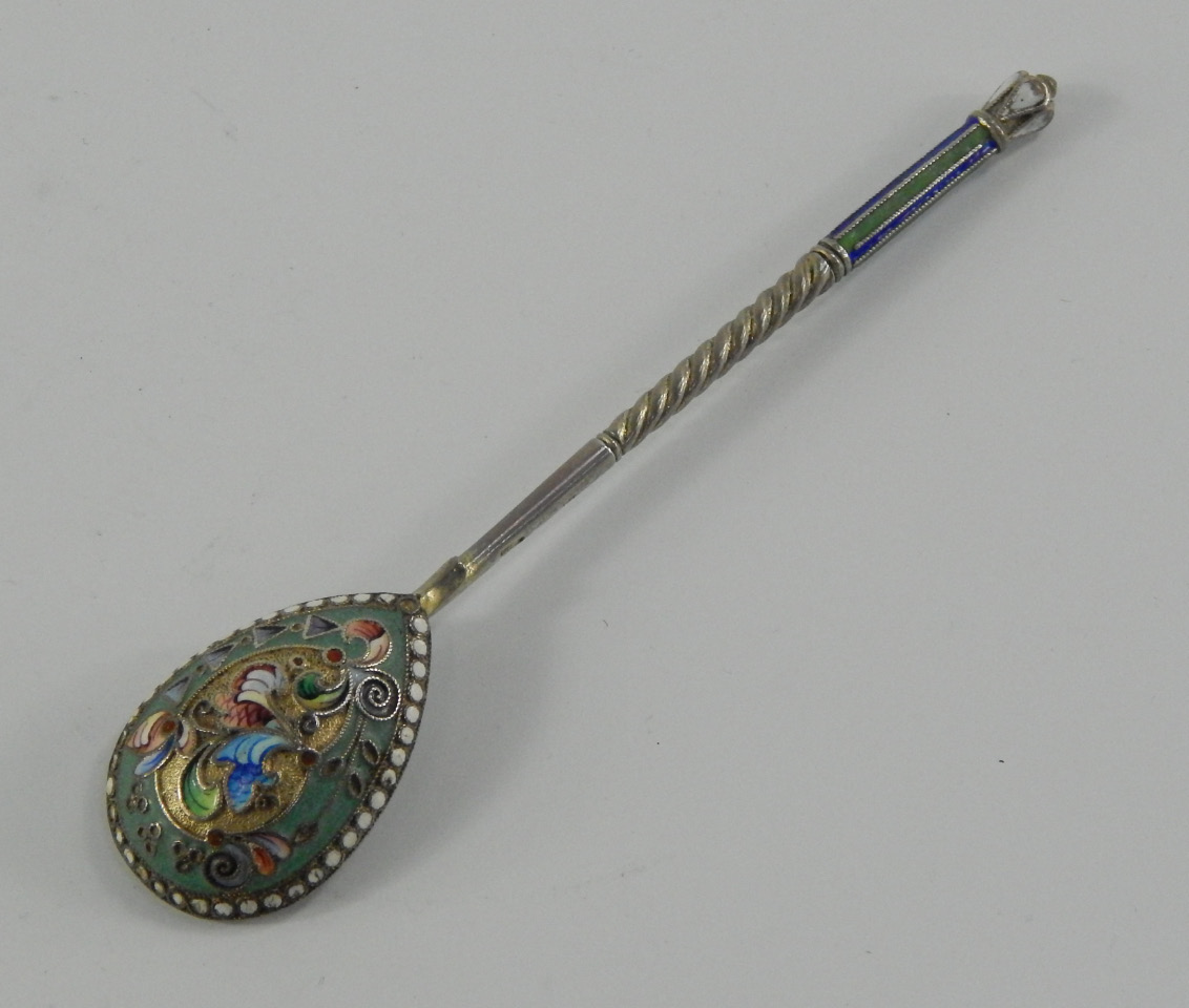 A Russian white metal and enamel spoon