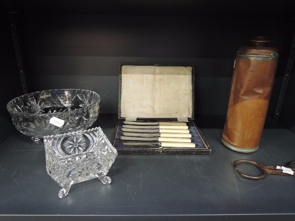 A selection of misc including cut glass, copper canister etc