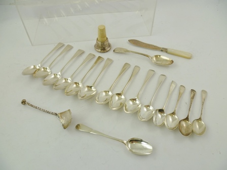 A SELECTION OF SILVER ITEMS to include; a George Unite Victorian silver bladed butter knife with mother of pearl handle, Birmingham 1871, a silver conserve spoon, a silver topped cork bottle stopper and a quantity of mixed assay silver teaspoons, wei