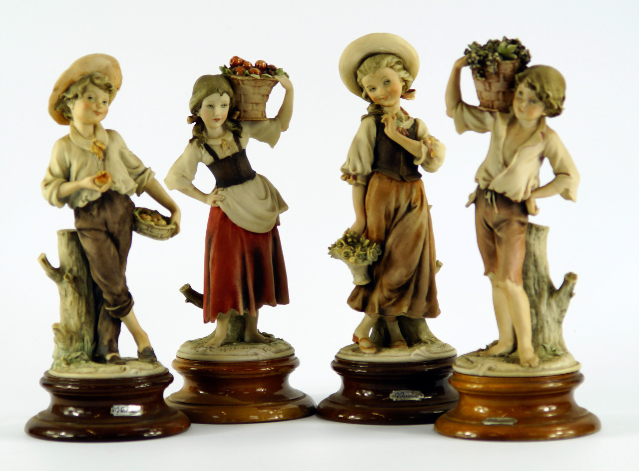 modelled as fruit sellers, grape seller and a rose seller, each raised on turned wooden socles