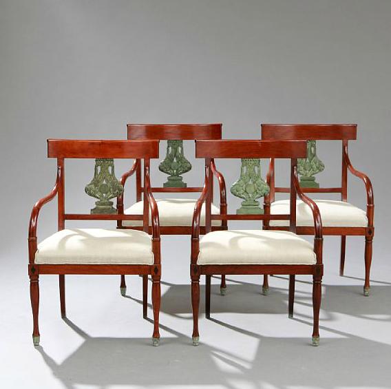 A set of four Russian late Empire mahogany armchairs with painted ornaments