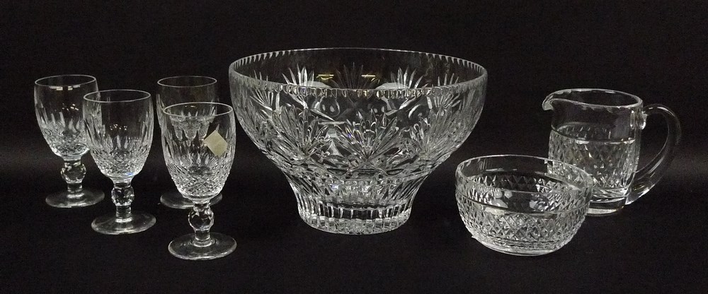 A set of four Waterford glass sherry glasses in the Colleen pattern, a Waterford jug, 10cm, and sugar bowl, and a Royal Doulton cut glass fruit bowl, 20 by 13cm.