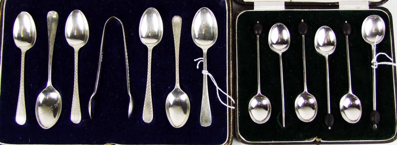 with bright-cut decoration, cased with sugar tongs, maker's mark of Thomas Bradbury & Sons Ltd, Sheffield 1926; and a matched set of six bean terminal coffee spoons, cased, maker's mark of Mappin & Webb Ltd, Sheffield 1926 (five only, one terminal de