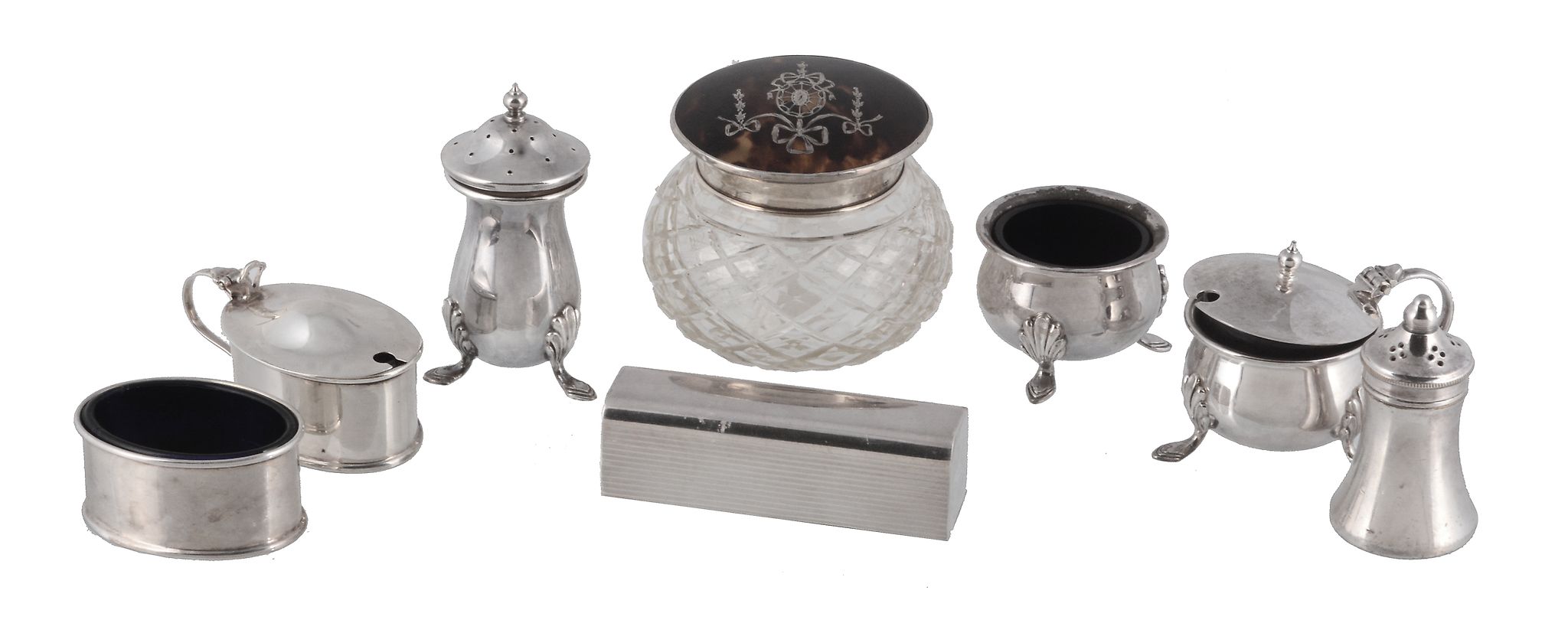 Birmingham 1919; a straight-sided oval mustard and salt, Birmingham 1934-35; an Italian lipstick box, post 1968 .925 standard; and four plated cruet items (8)