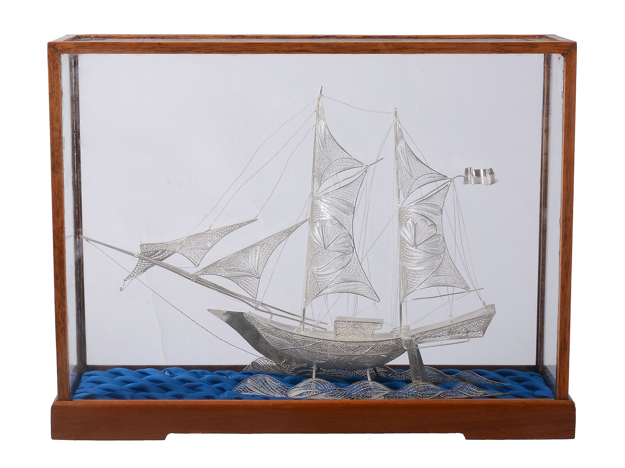 stamped 900 only, probably Asian, possibly Indonesian, late 20th century, 24cm (9 1/2in) high, 34cm (13 1/2in) long, 200g (6.4 oz), in a wood and glass display case