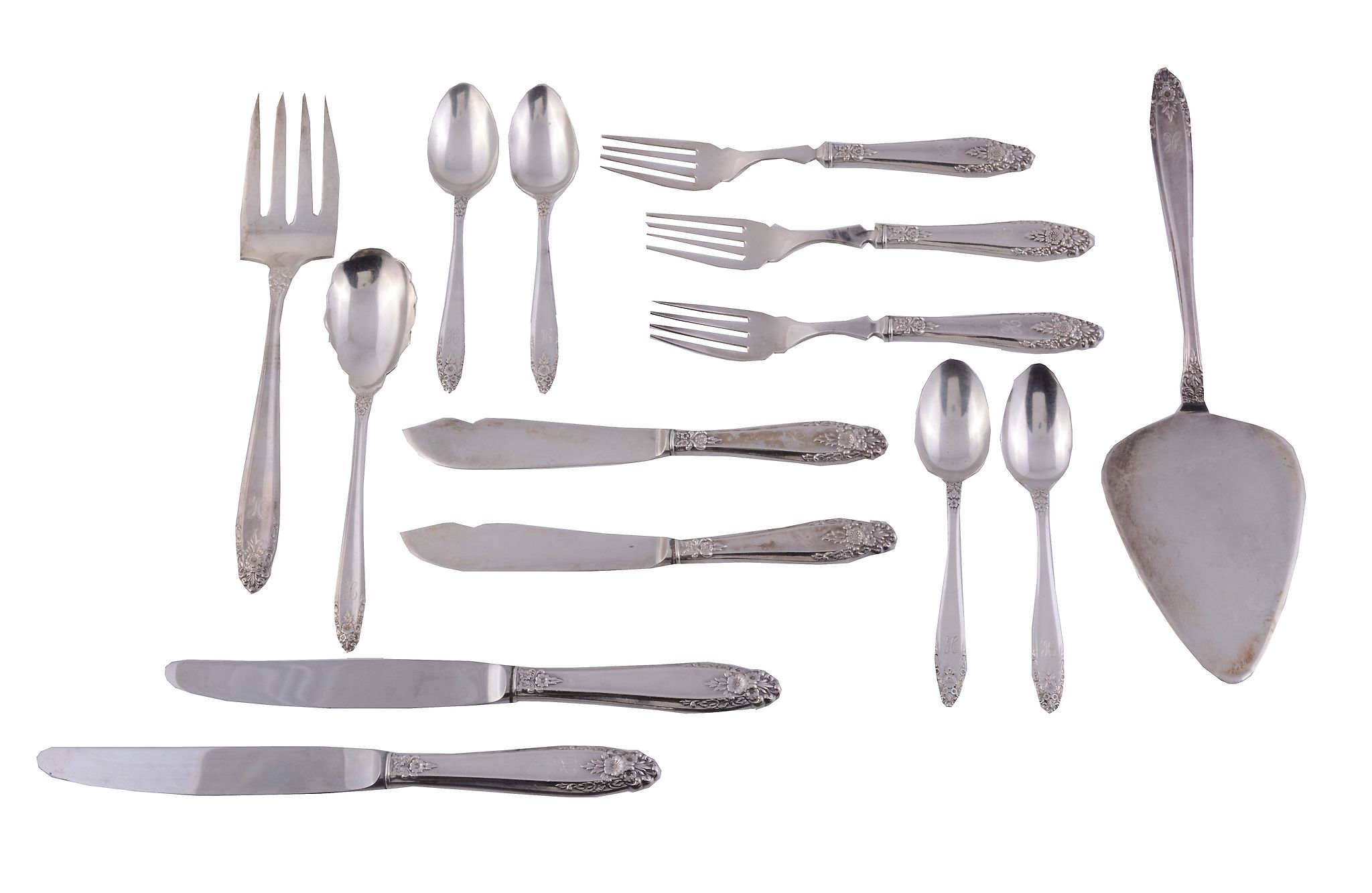 stamped Sterling only, mid 20th century, engraved H , comprising: Ten table forks Ten table spoons Ten dessert forks Ten soup/dessert spoons Ten butter knives Ten cake/pastry forks Ten tea spoons Ten coffee spoons A pair of fish servers A cake slice