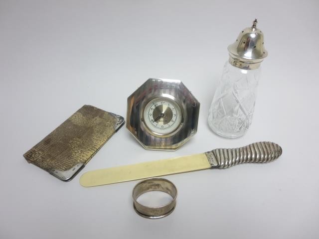 A silver handled ivory Page Turner, silver lidded cut glass Sugar Caster, silver framed octagonal Mantel Clock and silver mounted Purse