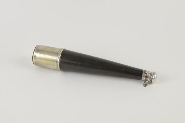 A silver mounted horn Hunting Flask with plated slip on cup to base, 10 1/2in, London 1869