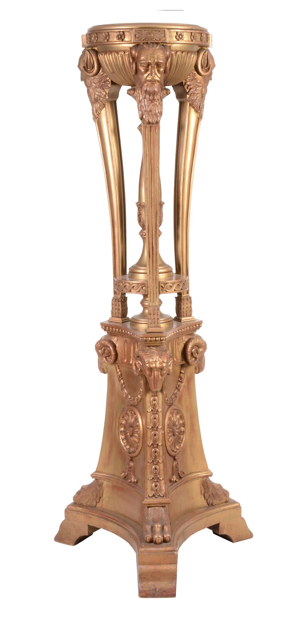 the dish top with reeded exterior and supporting horned masks on fluted stems and central baluster pillar, the tripartite bases with ramsheads, swags, and central paterae and bell-flowers to the angles, the whole on hairy lion paw feet and stepped ba