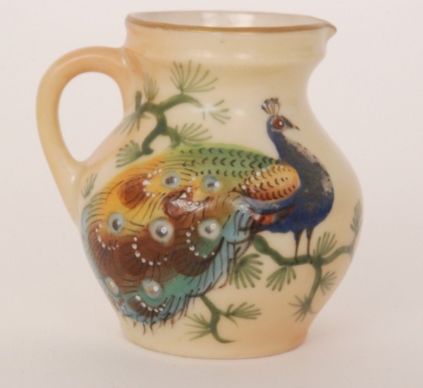 A small Locke & Co, Worcester jug decorated by Bach with a hand painted peacock, green printed mark, height 5.5cm