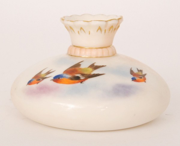 A small Locke & Co, Worcester vase decorated by H. Wall with two hand painted swallows in flight, signed, green printed mark, height 6cm