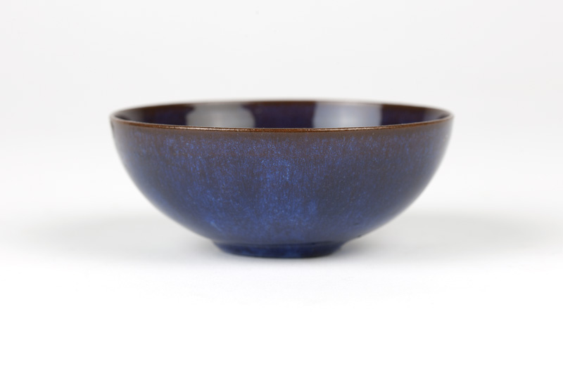 the squat circular bowl with a chocolate rim, all-over decorated in a dark blue glaze, on a short circular ring foot