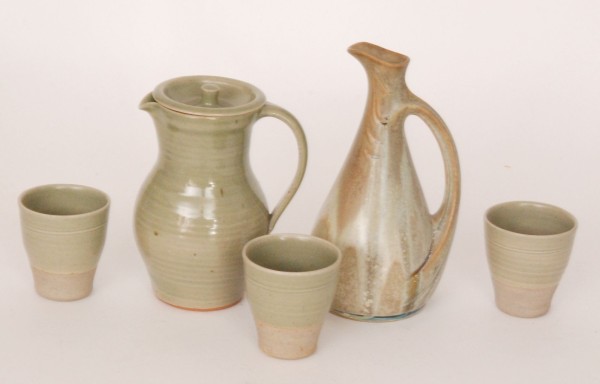 A St Ives studio pottery lidded lemonade jug decorated in a green slip with three matching beakers, all with impressed seal marks together with a Denbac Art Nouveau style pitcher, height 24.5cm (5)