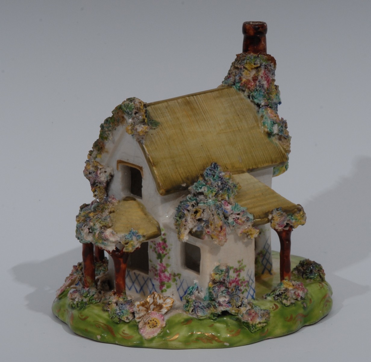 applied with shredded clay moss and flowerheads, in tones of yellow, green and brown, picked out in gilt, 12.5cm high, c.1840 . Condition Report: Chimney restored