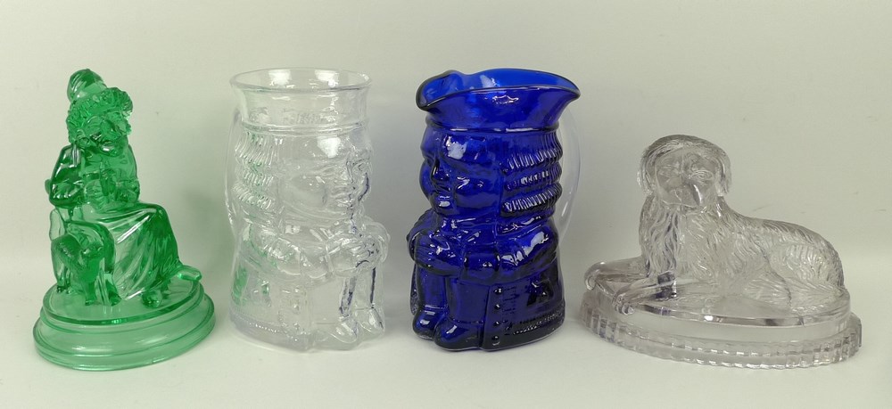 A Stuart Miller for Whitefriars 'Barnaby' blue glass Toby jug, one pint size with clear glass handle, 17cm high, a further clear glass Toby Jug pint mug, and two John Derbyshire glass figures, one a clear glass recumbent dog, 14cm, the other a lime g